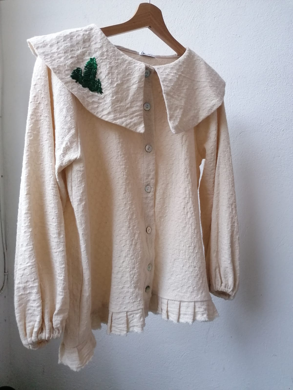 Guler amplu, nasturi sidef si broderie manuala cu brăduți.