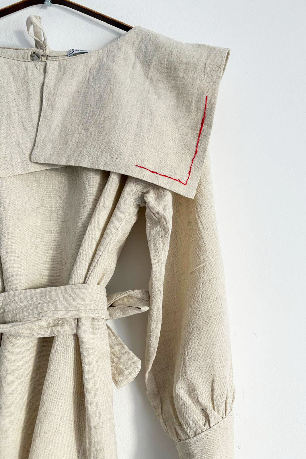 Bluză din bumbac cu guler realizat dintr-o pânză vintage, lucrată manual si ceva detalii de broderie cu fir roșu. Gulerul poate fi realizat si din alte țesături care sa imprime aceeași stare. Cordon fixat in talie. Produs unicat. In stoc avem mărimea S/M dar poate fi reprodusă orice dimensiune, la cerere.