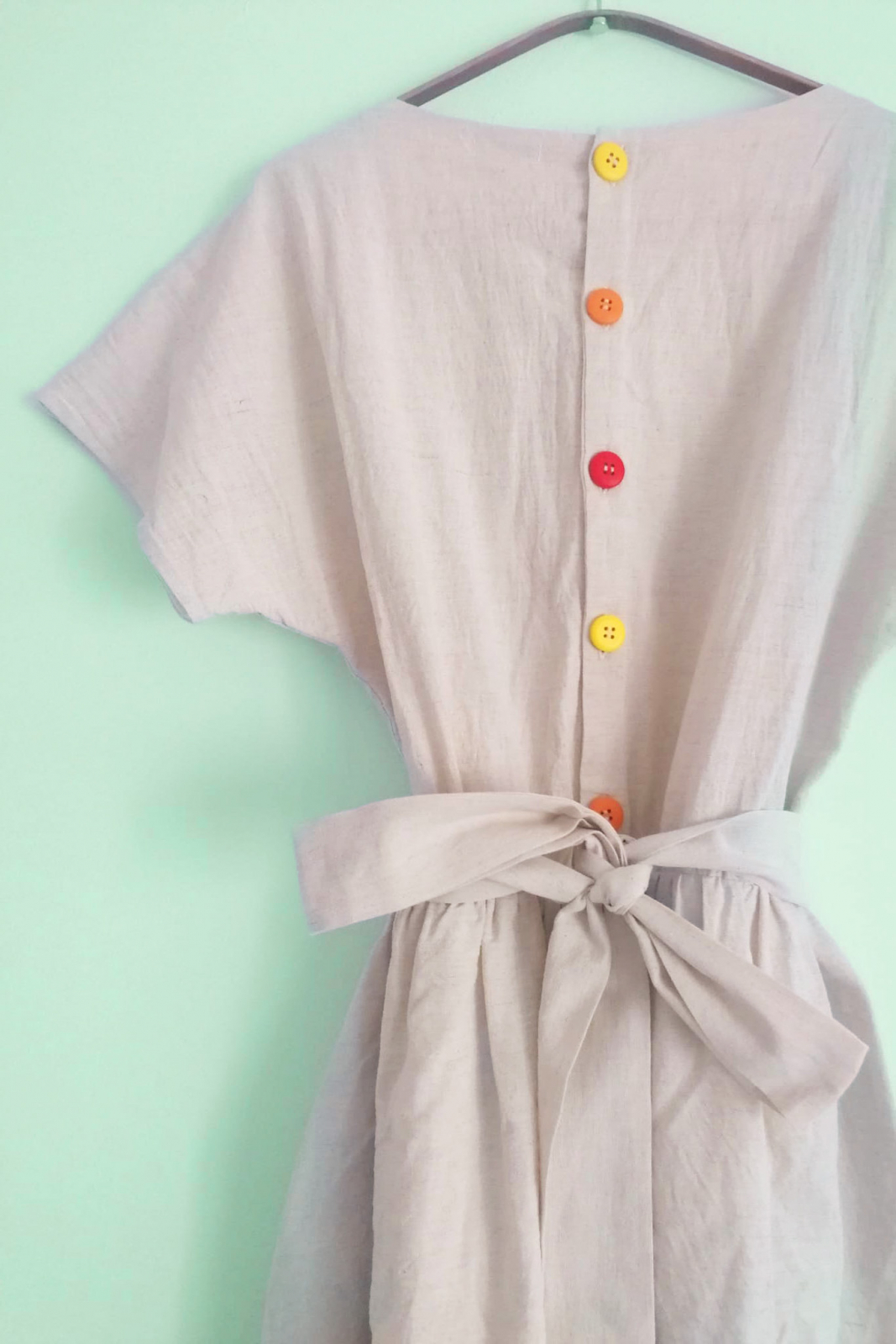 Nasturi de lemn colorați la spate si cordon in talie.