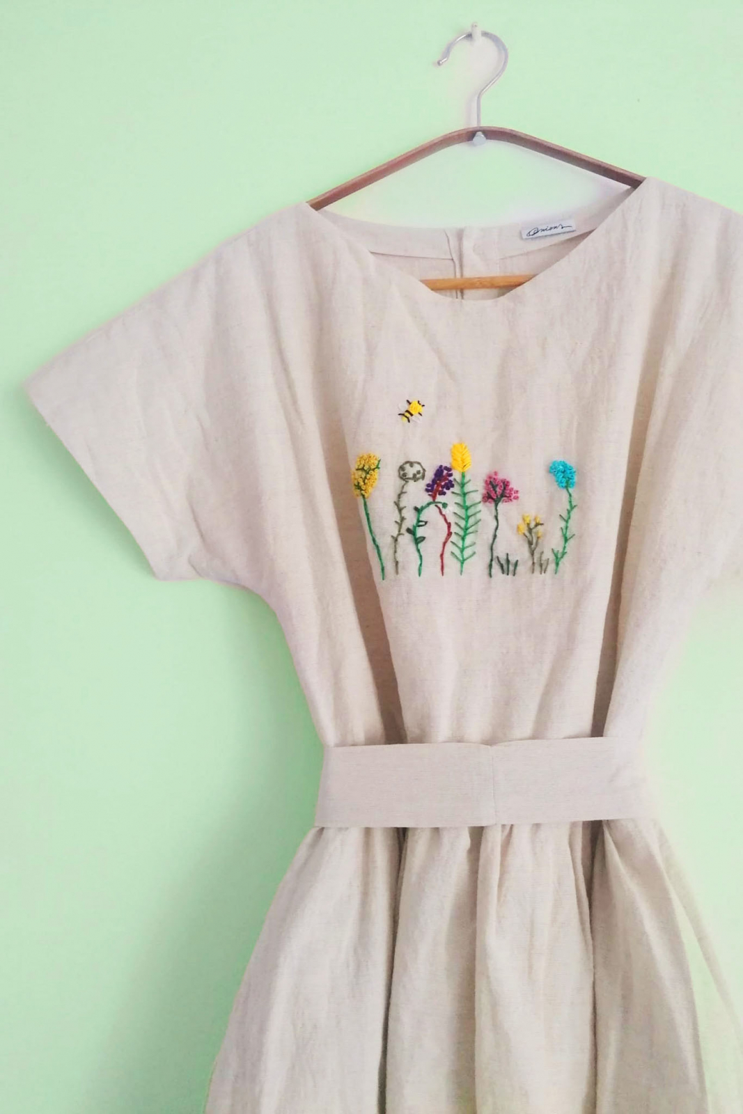 Este o rochie dintr-un bumbac, imitație de in, cu talia subliniată, broderie manuală, si mâneci căzute. Are o formă lejera, feminine și a fost foarte apreciată și iubită vara trecută.