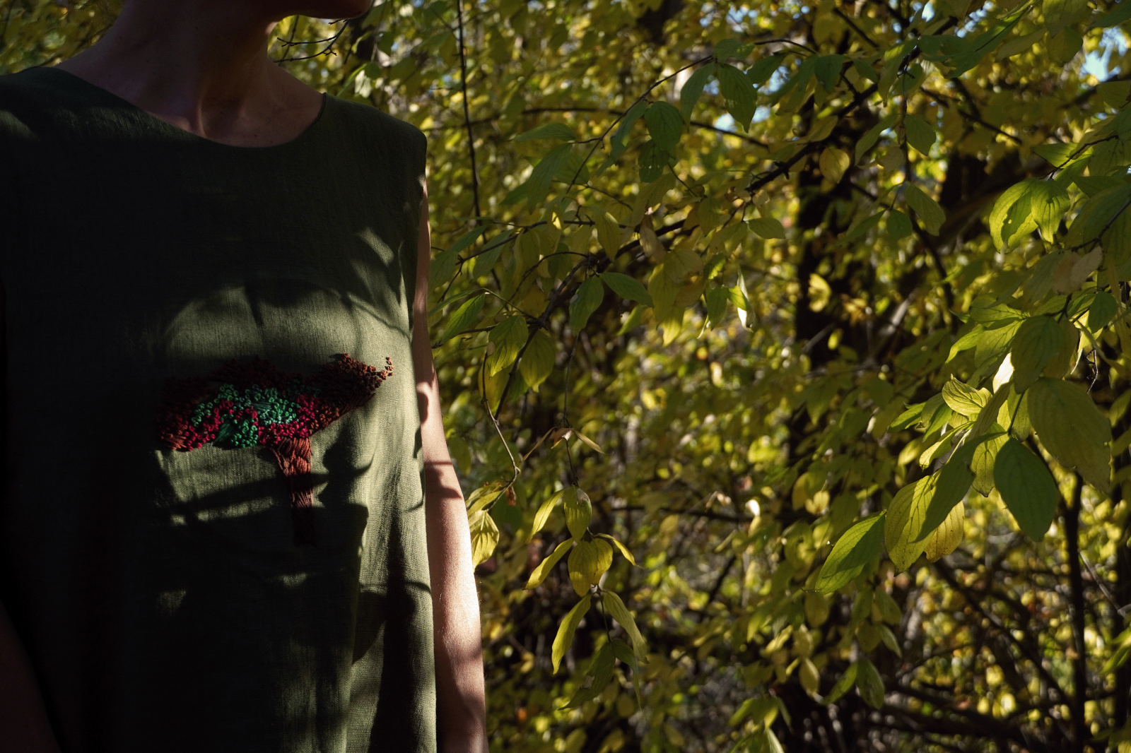 Rochie din in, lungime medie, dublată cu același in, cu volan realizat din pliuri, la terminație. Broderie manuala reprezentând Copacul vieții. Culorile broderiei pot fi alese împreună cu designer-ul.
