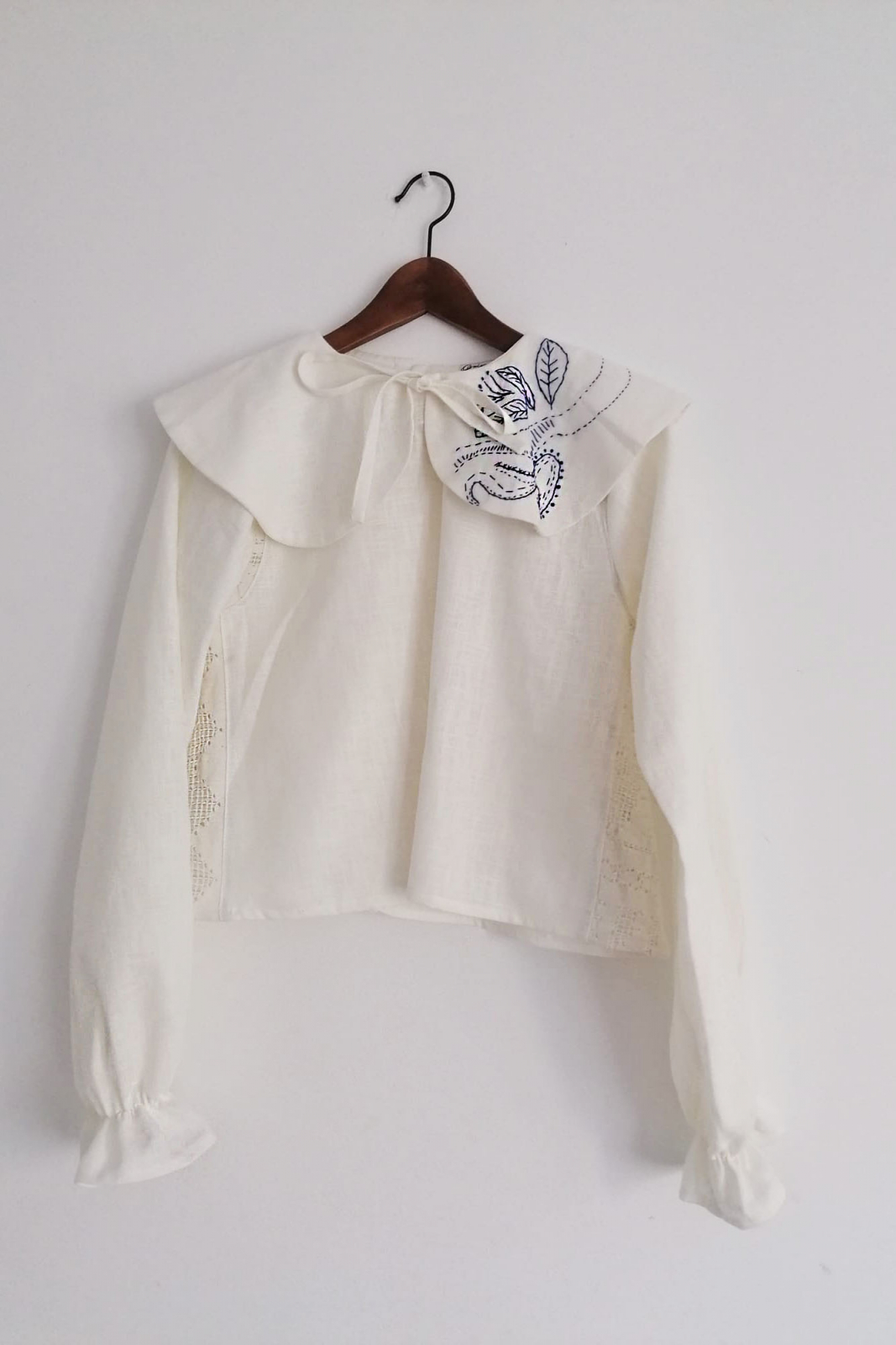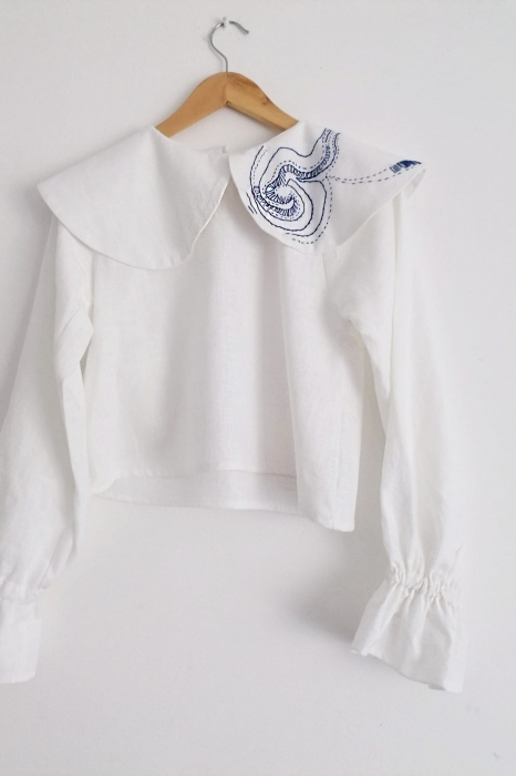 Bluză din in alb cu guler rotunjit si mâneci clopot lungi. Broderie manuala unicat, cu ață uni sau in culori armonizate.