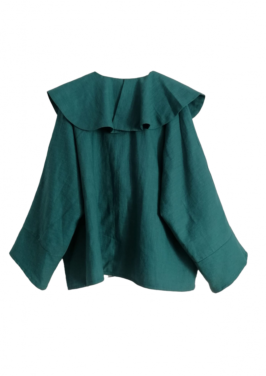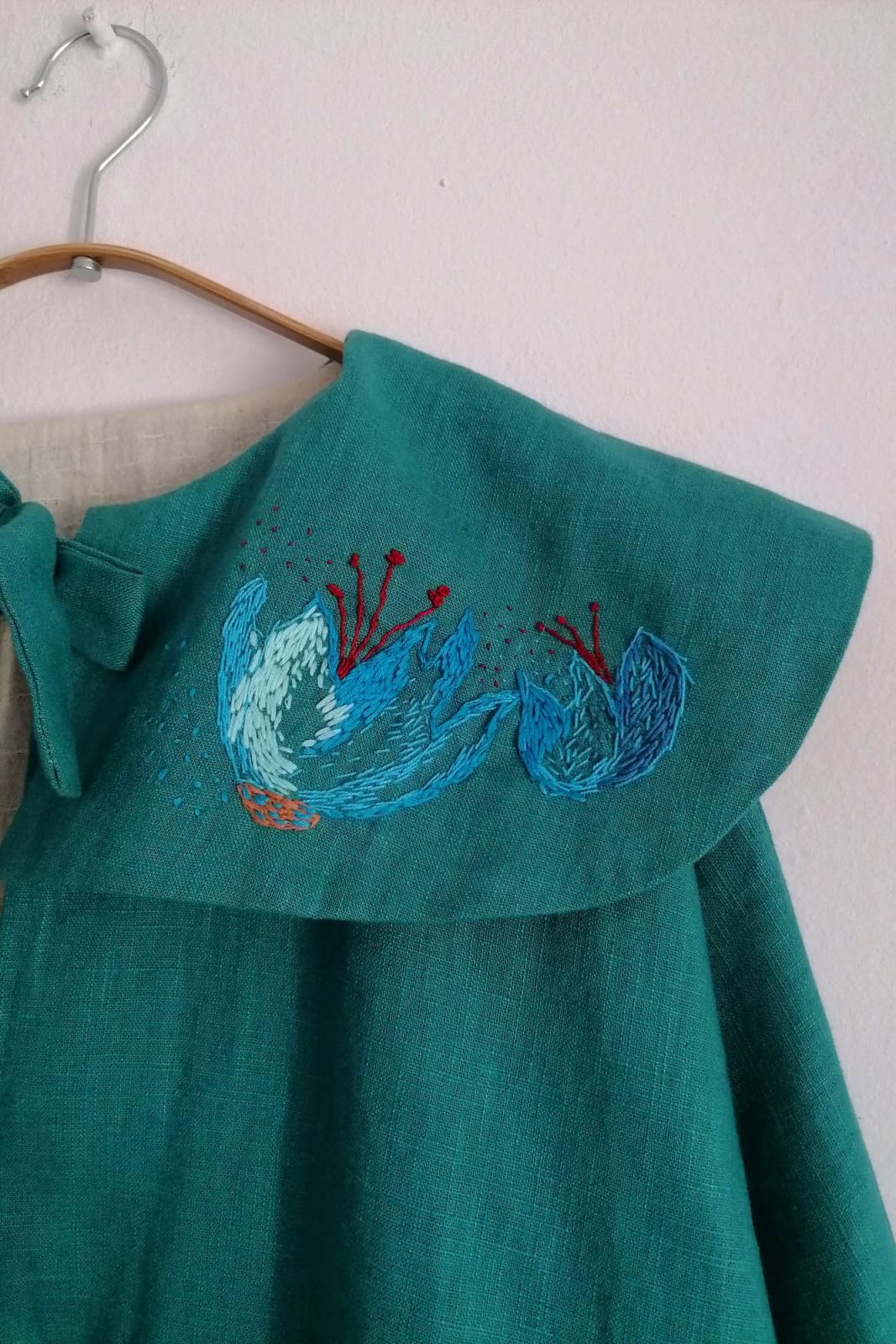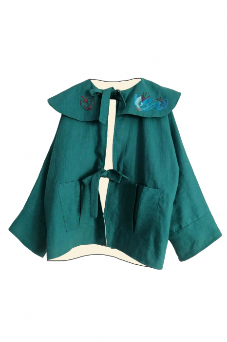 Blazer din in, dublat cu bumbac. Buzunare cu pliuri și guler rotund ușor supradimensionat cu broderie manuală pe guler.