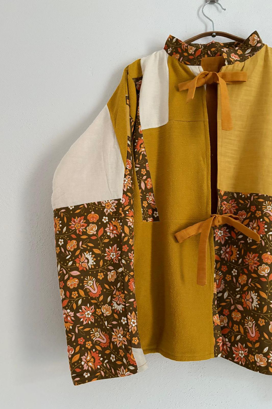 Blazer din patchwork din materiale din in si bumbac, dublat cu in. Este un produs ce poate fi purtat pe ambele fețe. Buzunare laterale pe ambele fete.