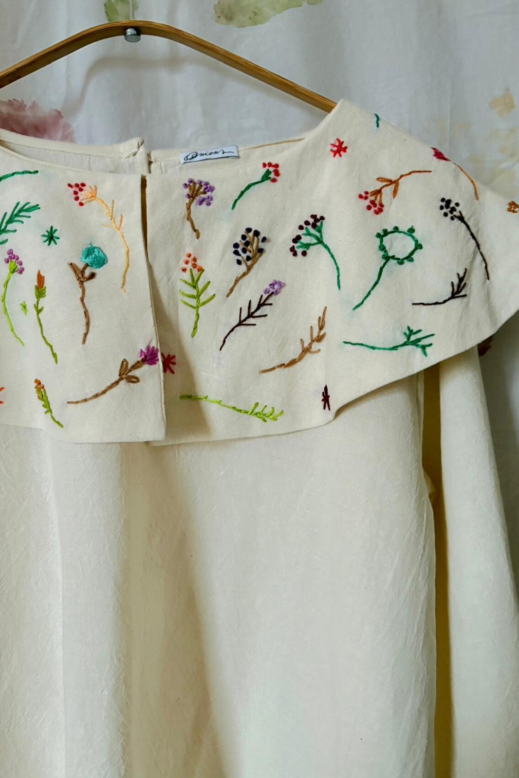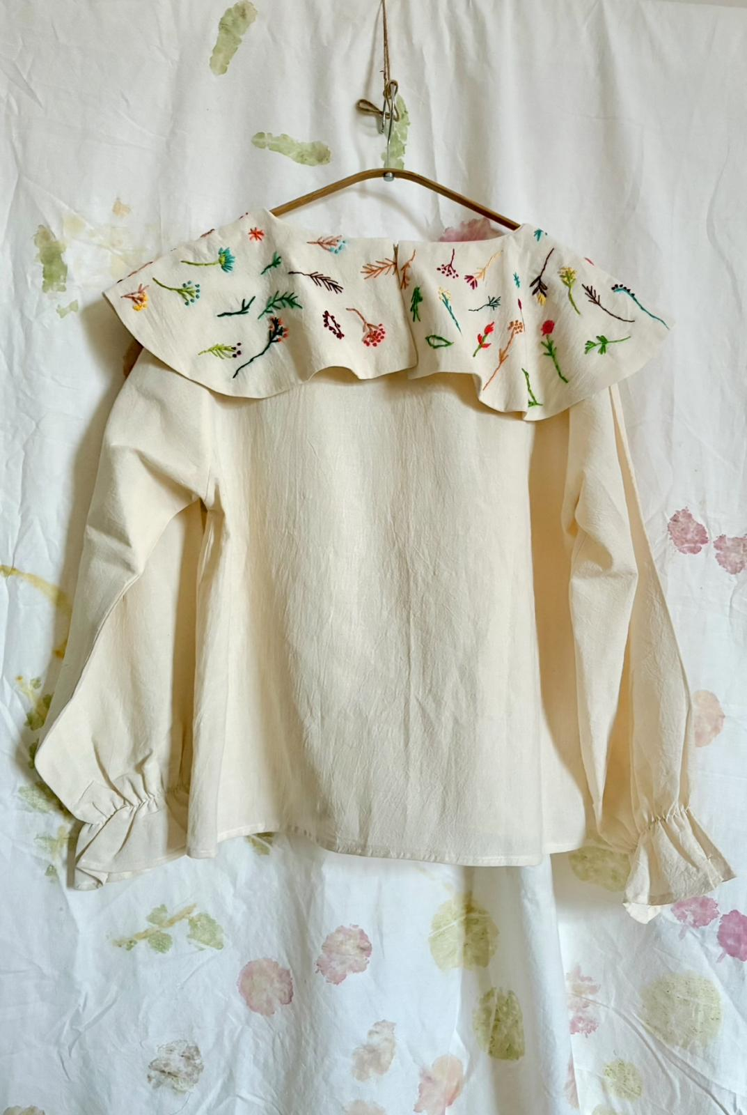 Bluză din bumbac ușor texturat, guler amplu și broderie manuală pe toată dimensiunea gulerului. Mâneci clopot, lejere care pot fi finisate cu o dantela din bumbac. va rog sa precizati acest lucru. Dimensiunea produsului este L, dar țineți cont că puteți specifica ce dimensiune si ce broderie doriți, atunci când comandați. Fiecare piesă este realizată in spațiul nostru de creație și în colaborare cu alte ateliere mici. De aceea, timpul de execuție pentru produsele cu statusul la comandă este estimat la intervalul 10-15 zile.