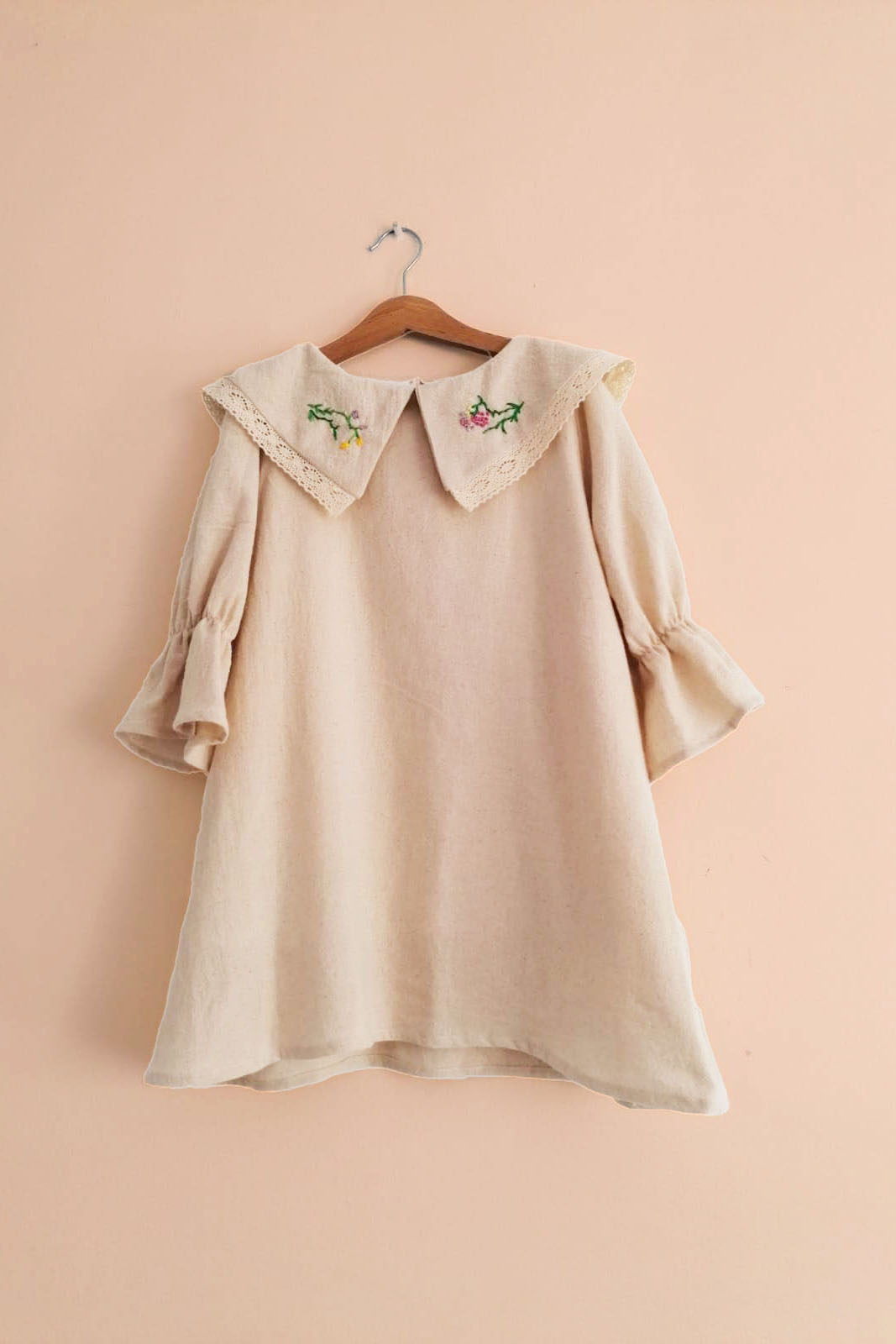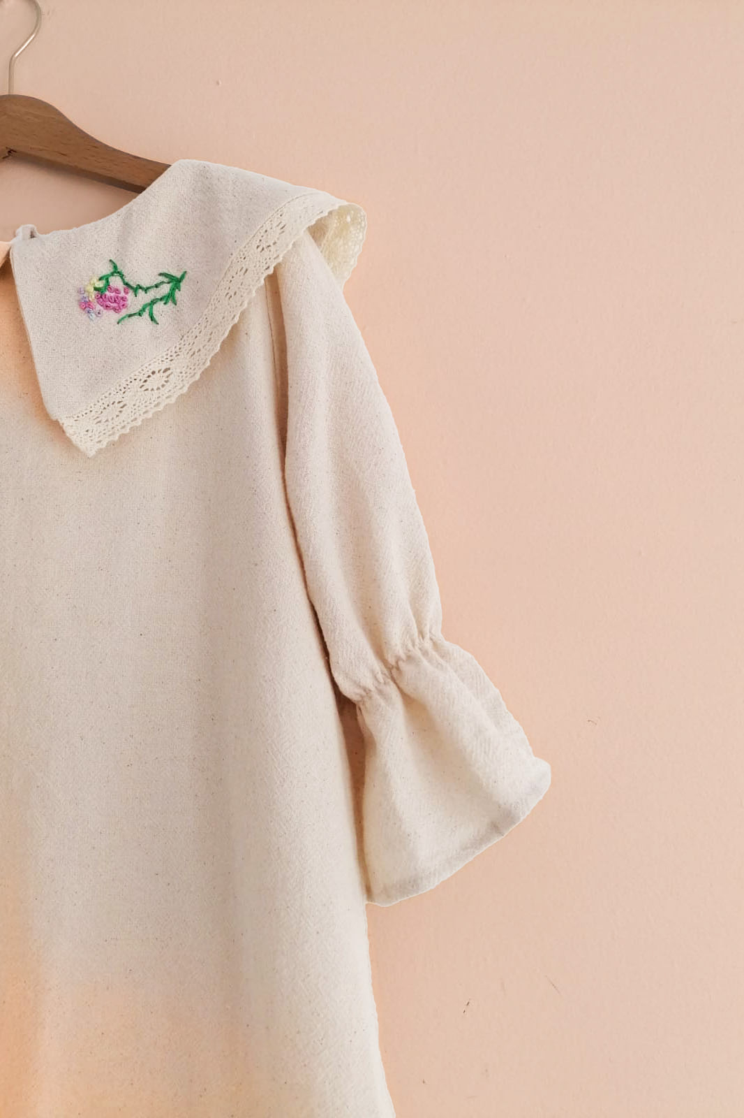 Guler delicat si brodat manual, cu o bordură din dantelă de bumbac pe terminația gulerului.