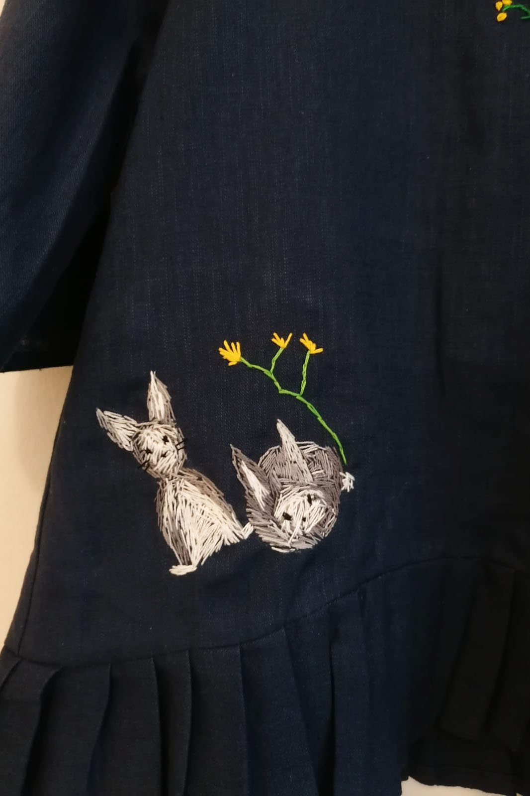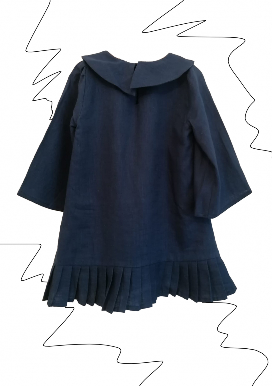 Rochie din in bleumarin cu broderie manuală și volan plisat.