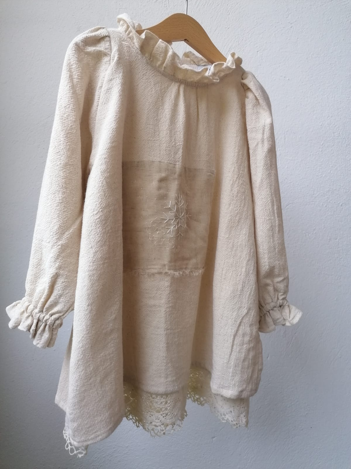 Rochie din bumbac ușor texturat, cu un guler volănaș discret, broderie cu fulg de nea si dantela de bumbac la terminația căptușelii.