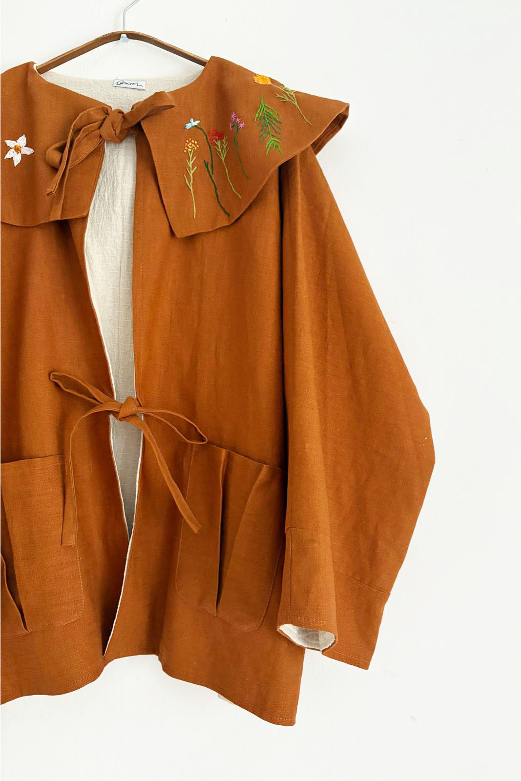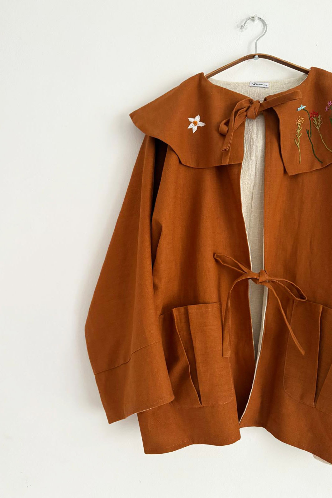 Blazerul este dublat cu bumbac, are un guler amplu si este brodat manual.