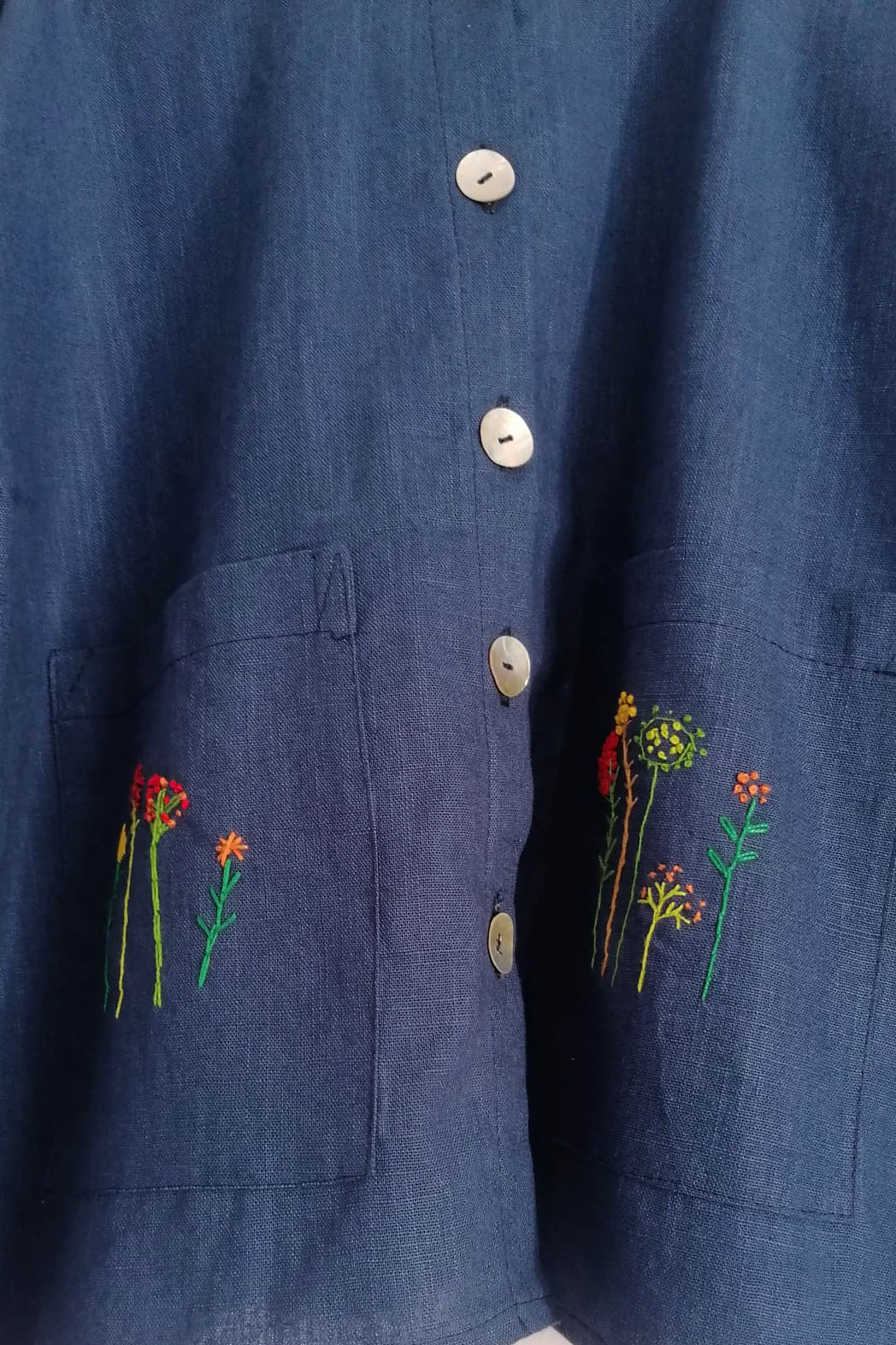 Cămașă din in plin bleumarin, cu nasturi sidef sau cocos(la alegere) și guler plisat. Buzunare dreptunghi cu broderie manuală. Mâneci balon lungi cu elastic la terminație. Dimensiune produsului este S/M dar putem realiza același model pe diferite dimensiuni si țesături, la cerere. Fiecare piesă este realizată in spațiul nostru de creație și în colaborare cu alte ateliere mici.