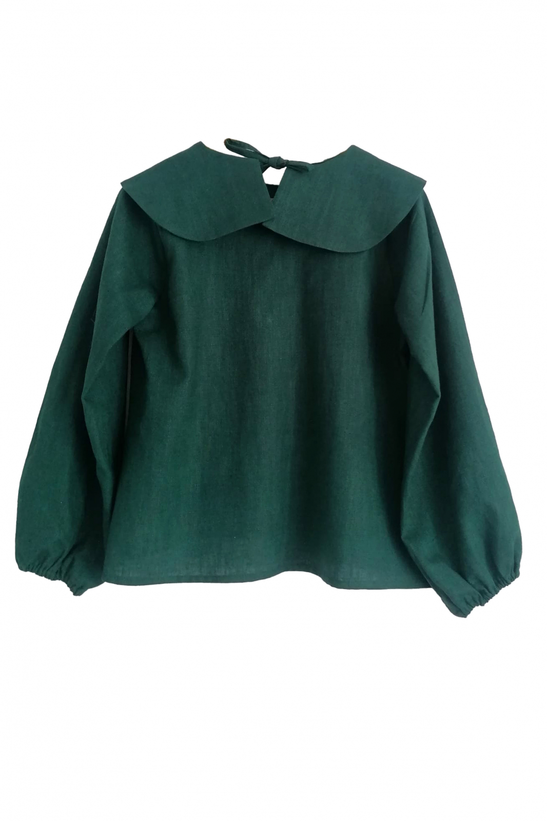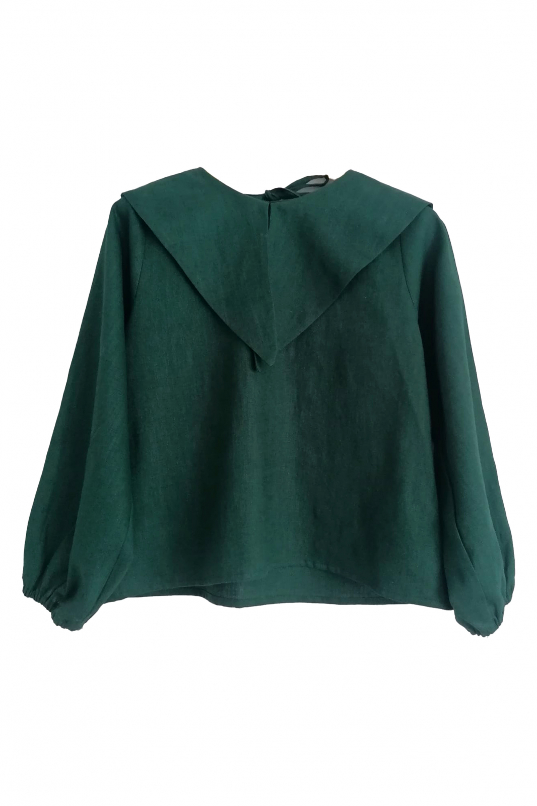 Bluză din in verde cu guler ascuțit. Formă lejeră, mâneci balon cu elastic la terminație. Dimensiune produsului este S/M dar putem realiza același model pe diferite dimensiuni, culori și țesături, la cerere. Fiecare piesă este realizată in spațiul nostru de creație și în colaborare cu alte ateliere mici.