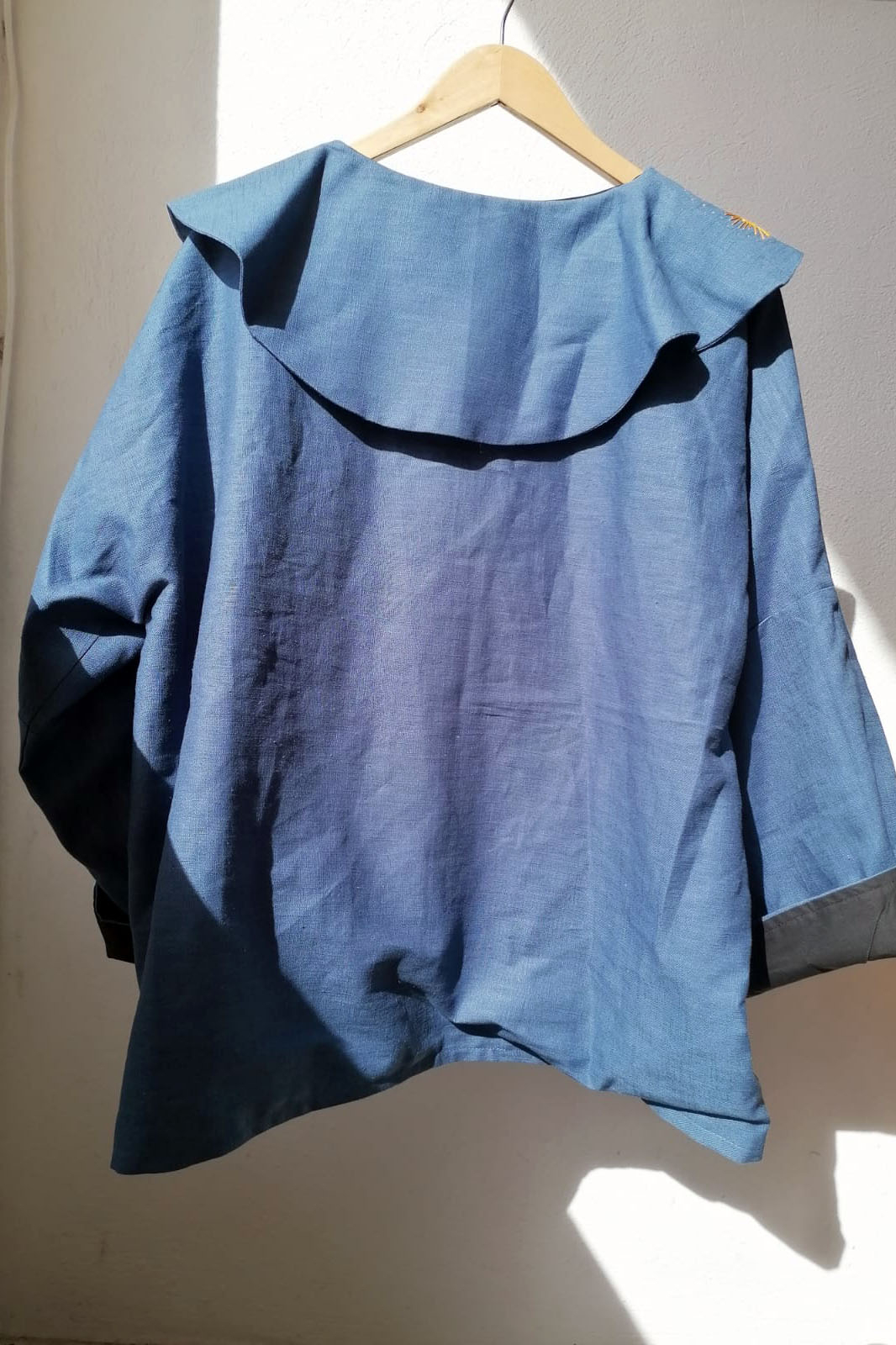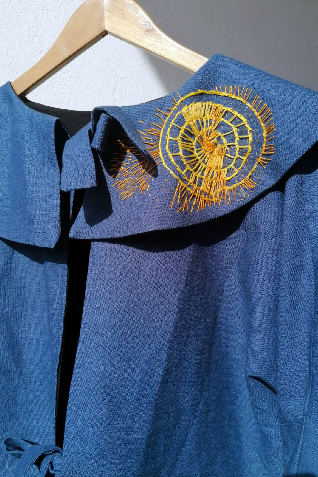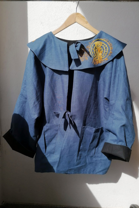 Buzunare cu pliuri și guler rotund ușor supradimensionat cu broderie manuală pe guler.
