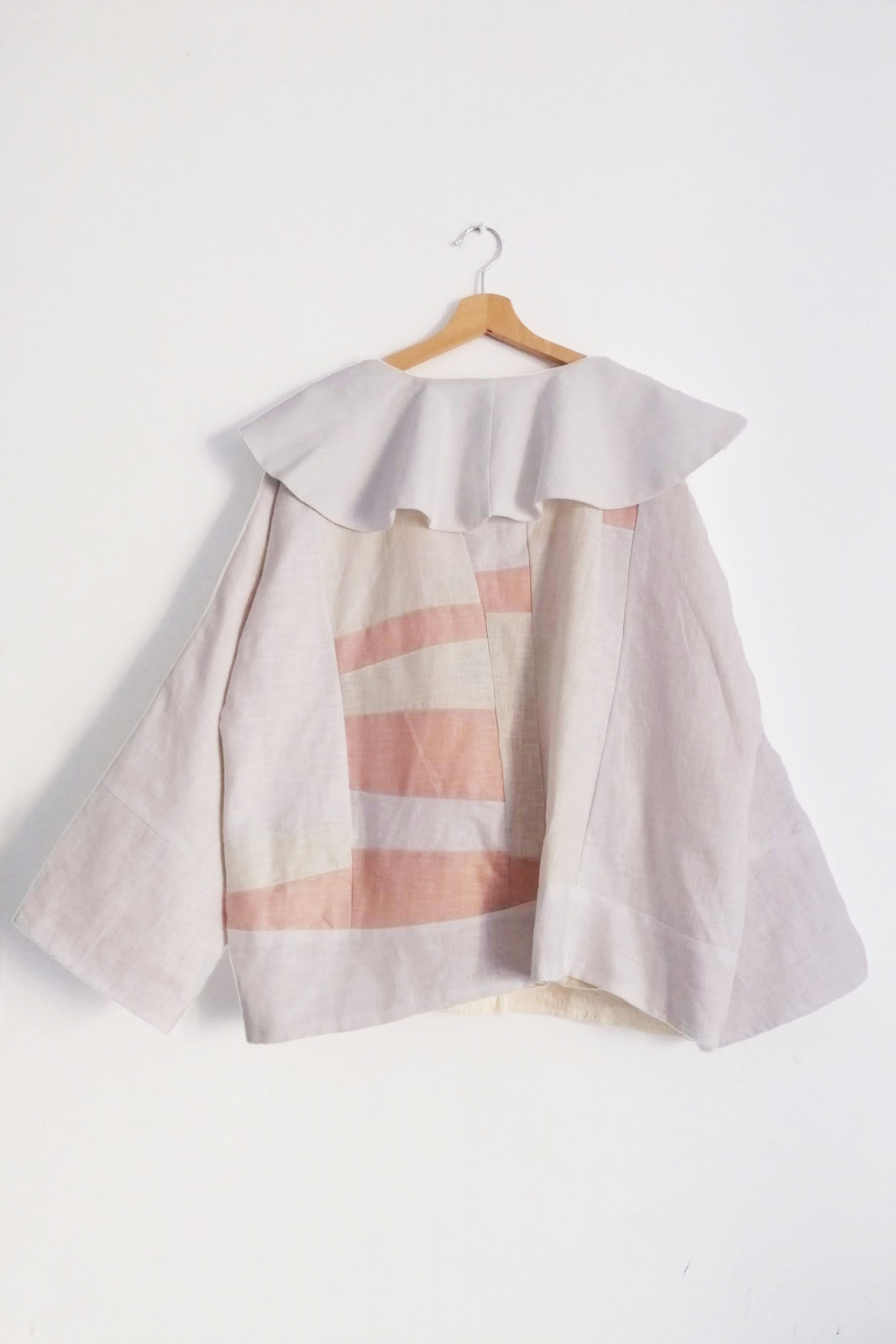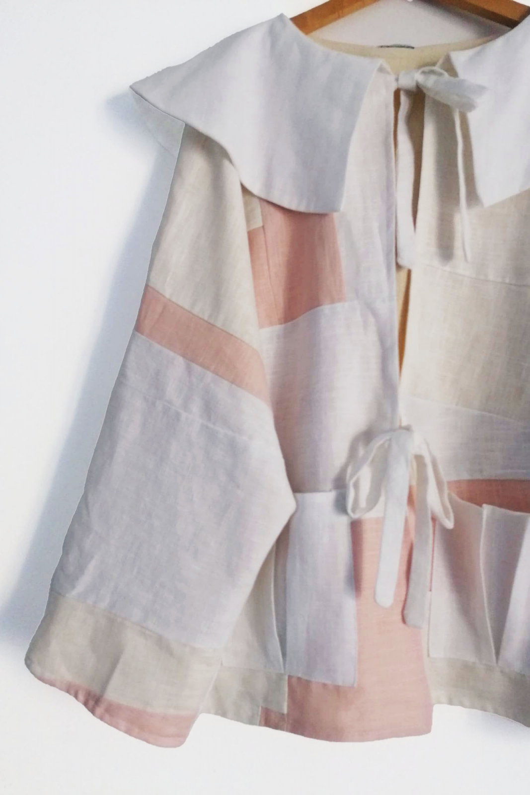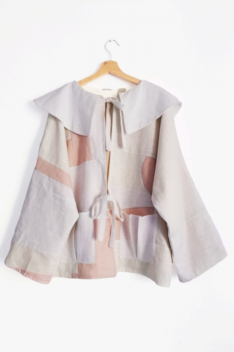 Blazer pastel din patchwork din in. Forma kimono inspired, dublat cu bumbac.