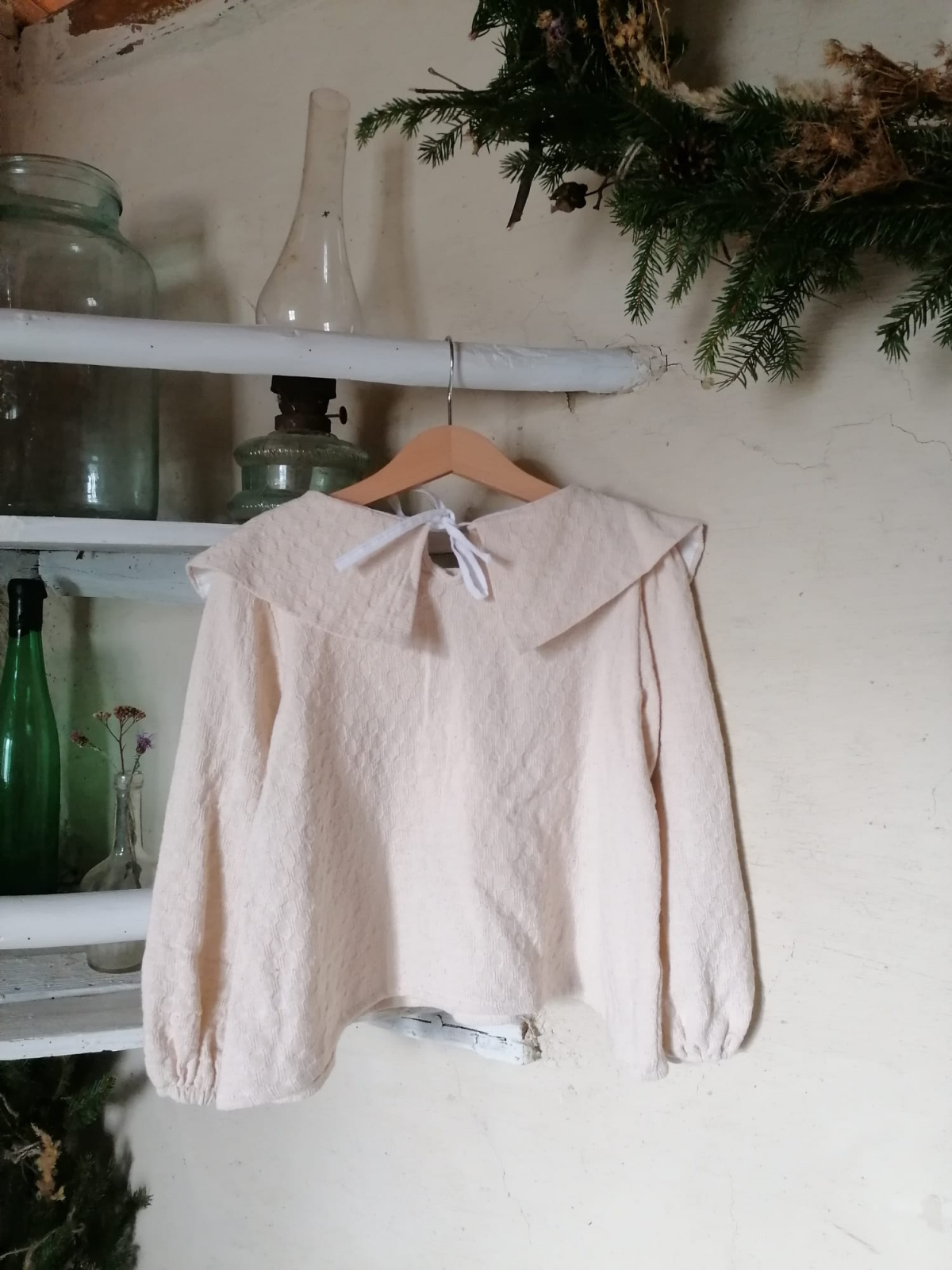 Realizata dintr-un bumbac texturat si crud, broderie manuala si guler Peter pan alungit.