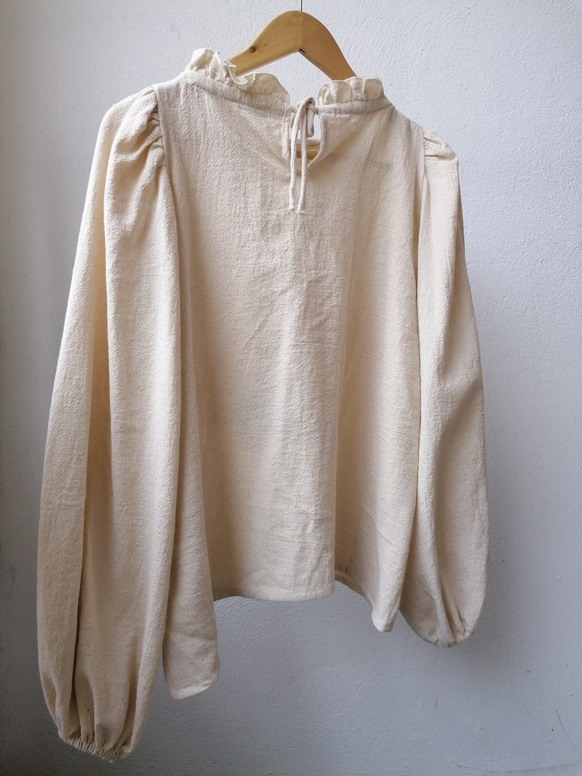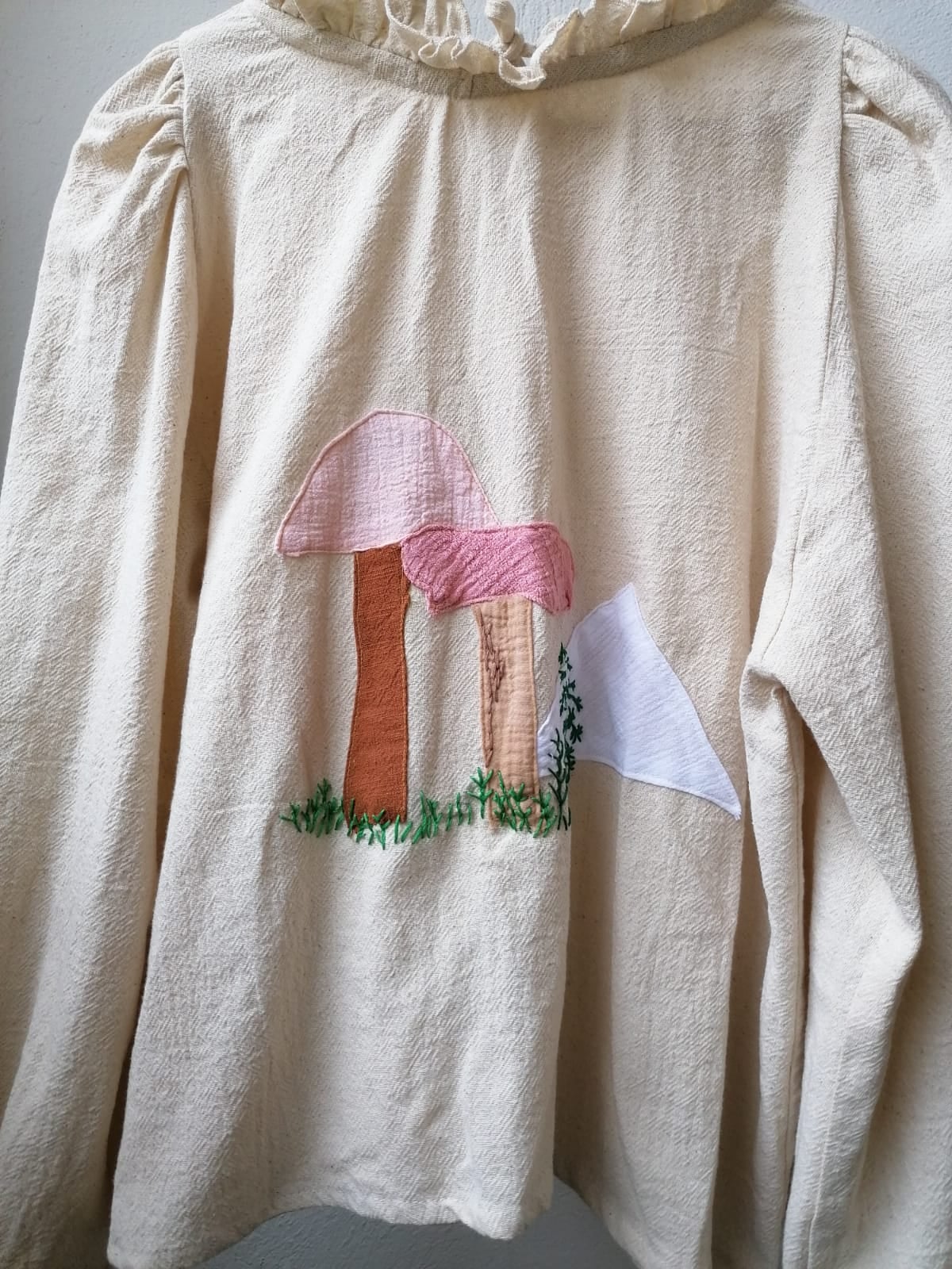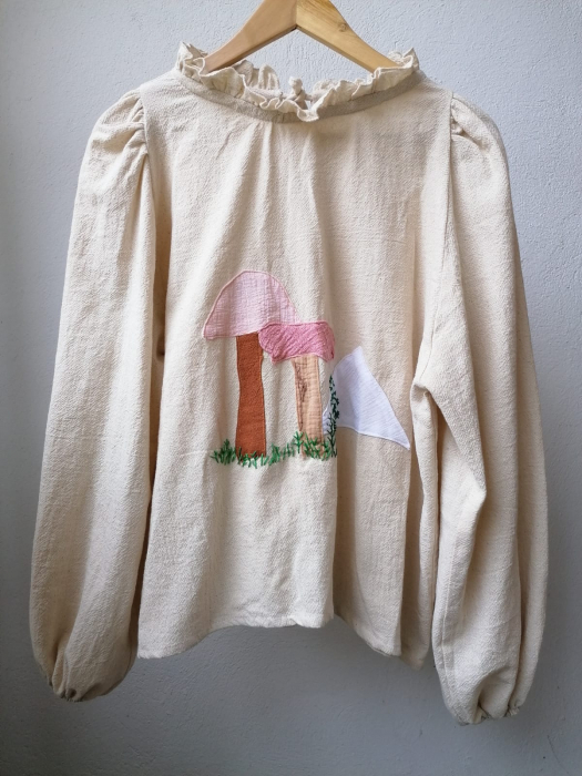 Are detalii manuale, aplicație cu broderie handmade, guler volănaș, mânecă raglan.