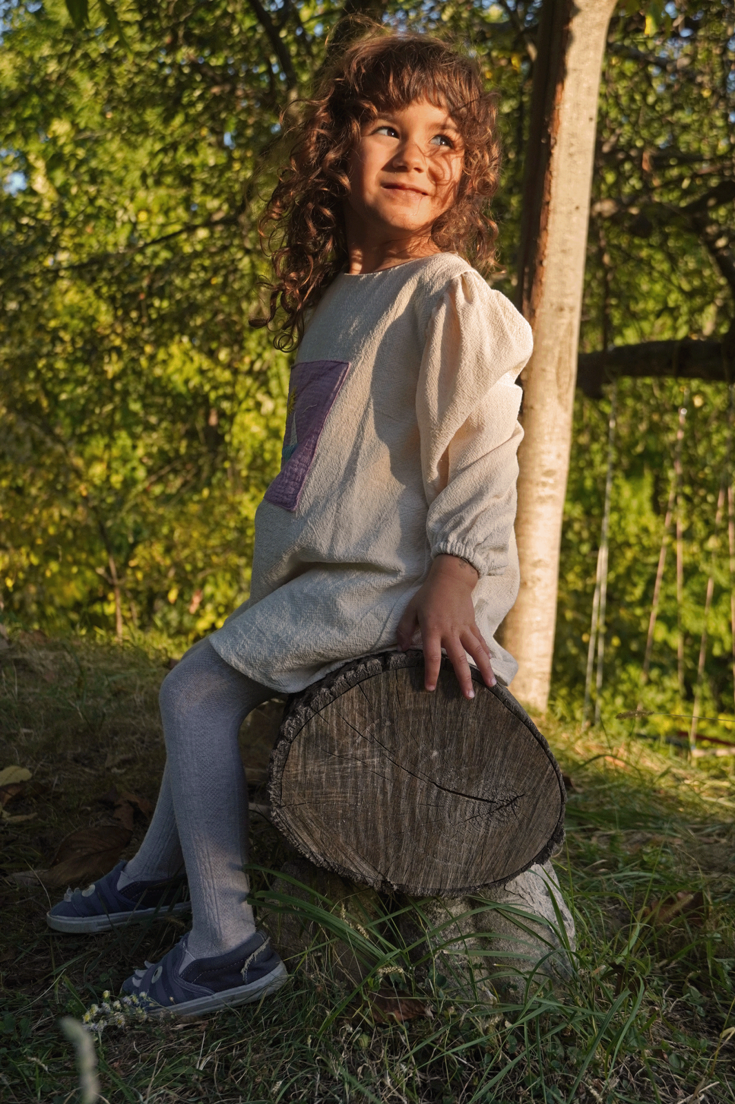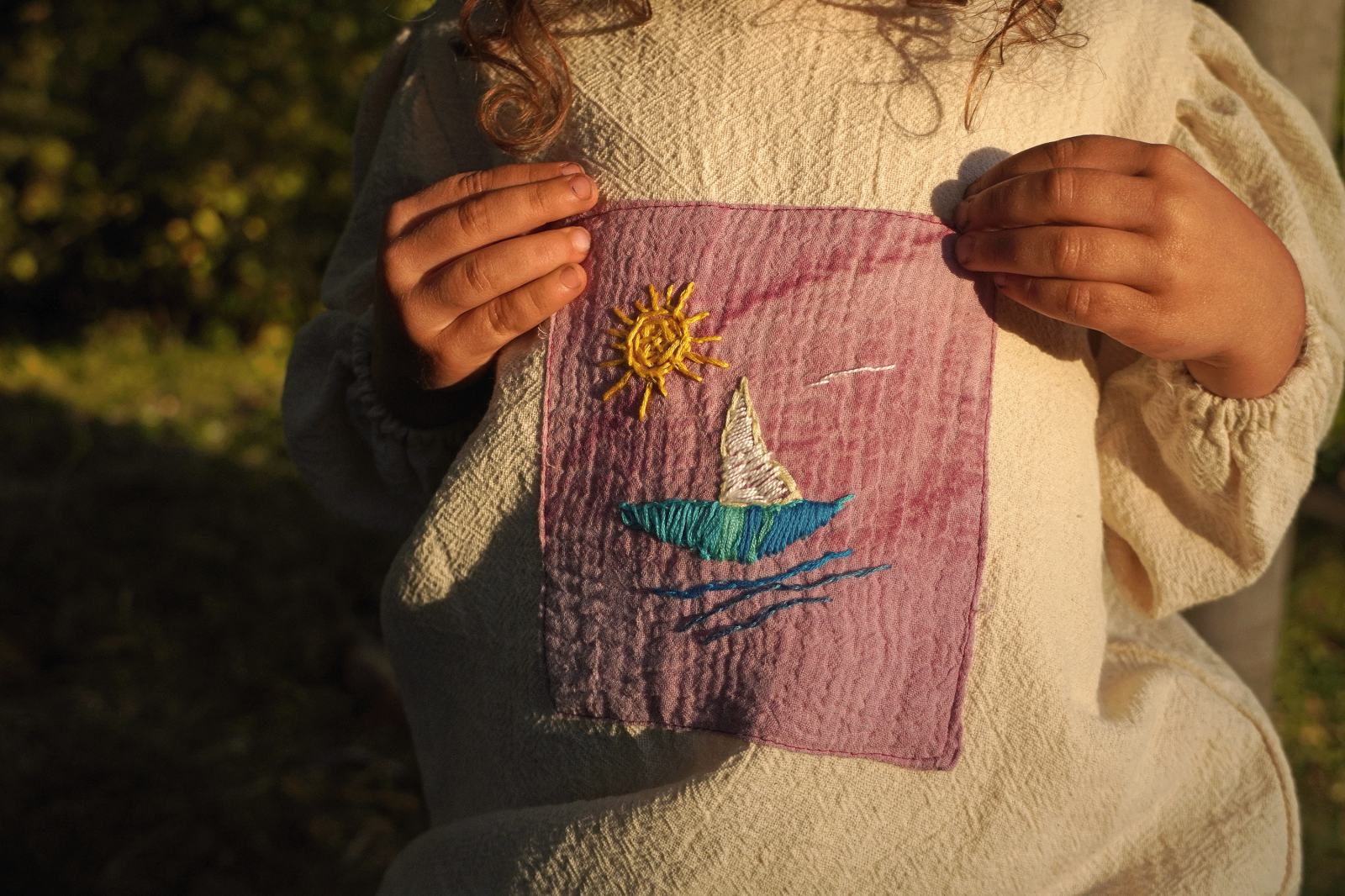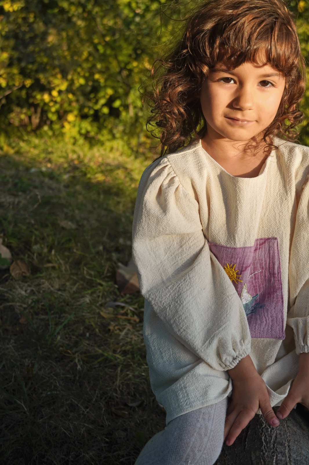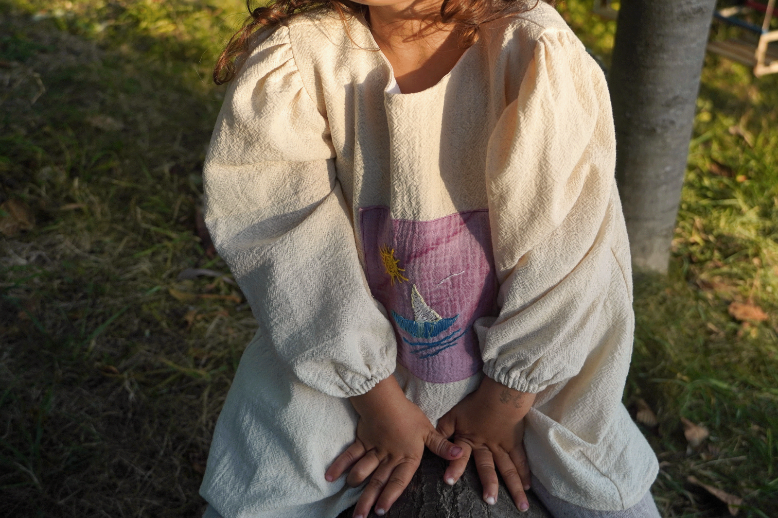 Rochie pentru fete, din bumbac delicat, cu o textură naturală. Aplicația cu broderie este vopsită cu fructe de soc. Broderie hand made inspirată de calatorii in Grecia. Rochia este dublată cu o pânză de bumbac alb. Modelul este 98-104 cm si poarta dimensiunea rochiei de 92-98 cm.