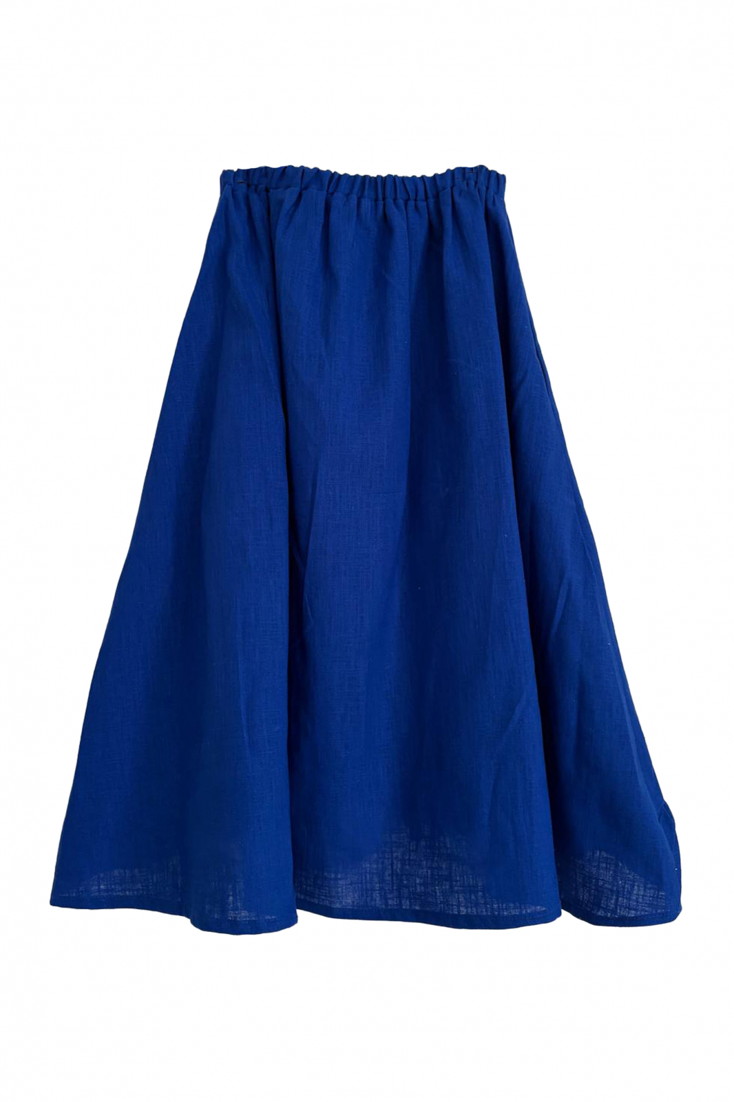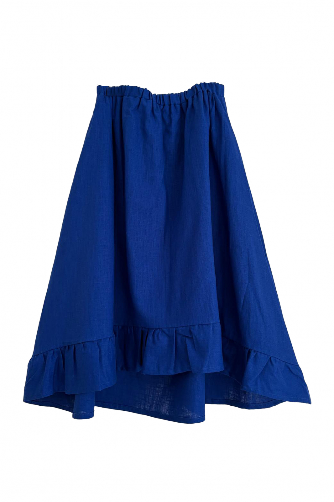 Fustă din in albastru electric, cu buzunare laterale si volănaș in față.