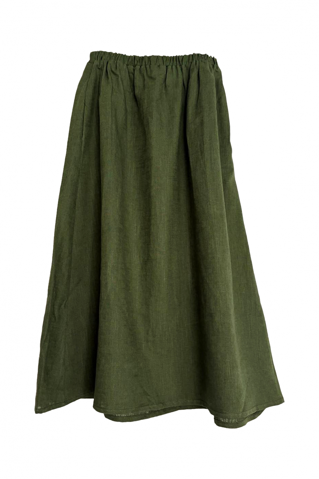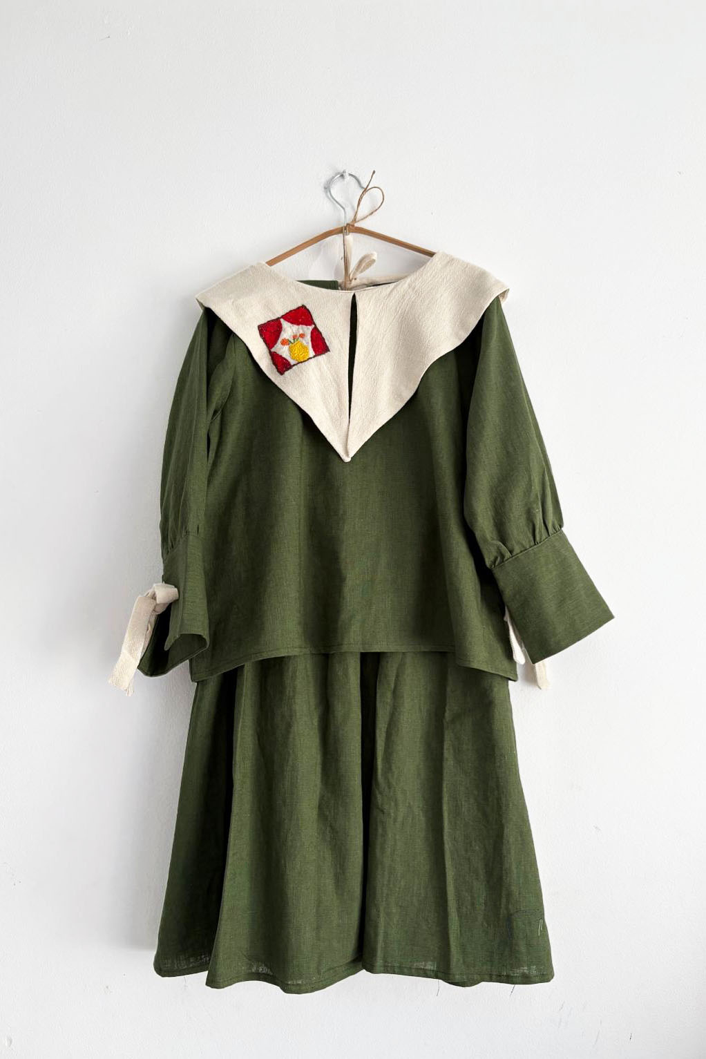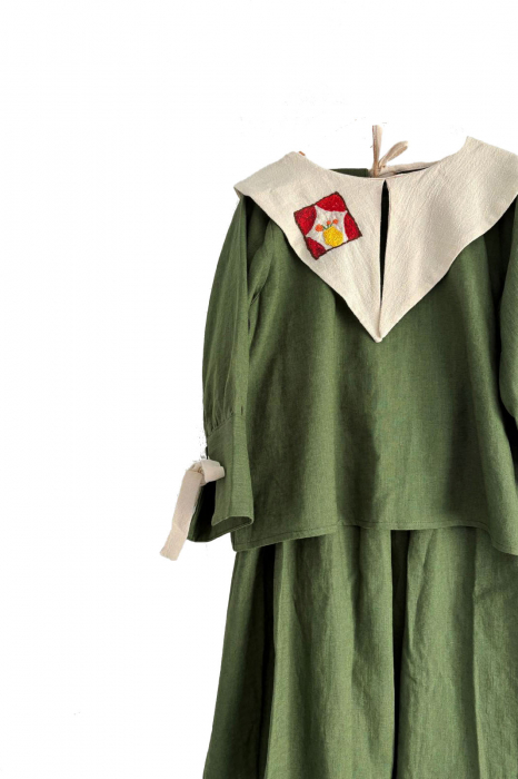 Bluză din in cu broderie manuală si fustă din in cu buzunare laterale.