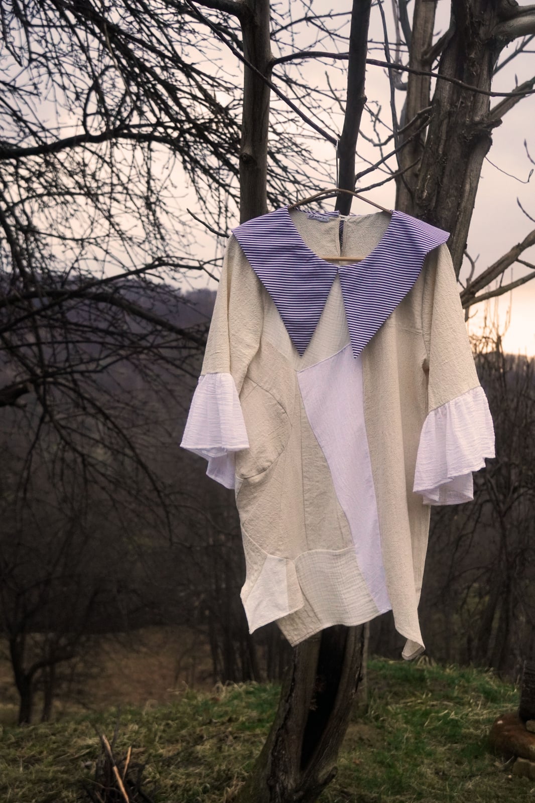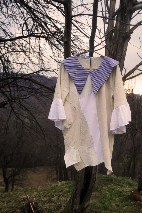 Bluză din patchwork cu o atmosferă mai teatrală, scenică, realizată din bucăți de bumbac organic pentru o abordare zero waste, mai prietenoasa cu natura.