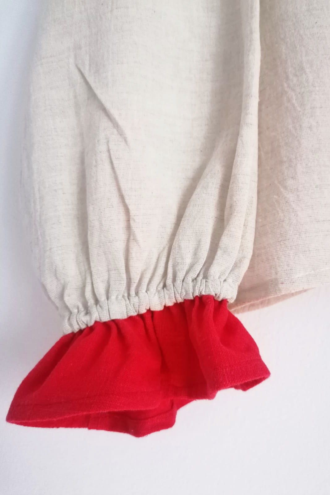 Bluză din bumbac cu guler roșu din in. Mâneci clopot cu terminații tot din in. Forma lejera, absolut minunata pentru un accent feminin dar totuși confortabil. In stoc avem mărimea S/M dar poate fi reprodusă orice dimensiune, la cerere.